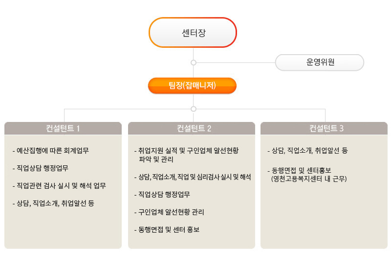 | 컨설턴트 3 | - 상담, 직업소개, 취업알선 등 - 동행면접 및 센터홍보 (영천고용복지센터 내 근무) |